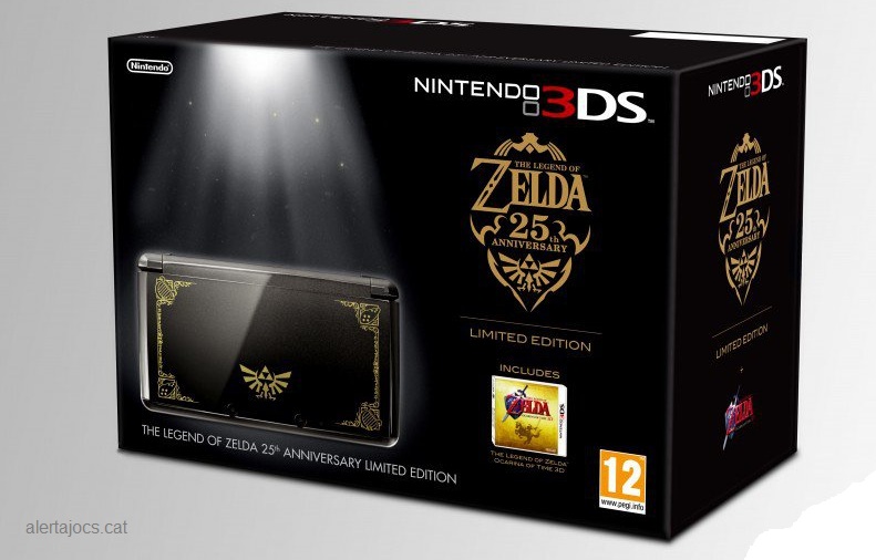 I Nintendo continua homenatjant a la seva saga més MÍTICA, The Legend of Zelda, que celebra el seu 25è Aniversari. Avui ens presenten una Nintendo 3DS d’Edició Especial (i LIMITADA) que porta gravats a la carcassa uns motius daurats de l’emblema reial i diferents instruments clàssics. A més a més, les lletres dels botons de l’interior (i fins hi tot el regulador de l’efecte 3D) també seran daurats.