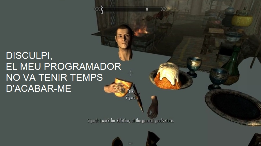 El recent estrenat “The Elder Scrolls V: Skyrim” per a PS3, X360 i PC… que ha estat durant tant de temps en els somnis més humits de milers d’usuaris… està rebent fortes patacades, precisament per aquest motiu. No han passat ni 48 hores des del seu llançament i ja podem trobar vídeos a la xarxa que mostren diferents errors de programació del joc. És alarmant i vergonyós que Bethesda i altres companyies, ens venguin videojocs que no han finalitzat amb èxit l’etapa de proves. I encara més, tenint en compte els esforços econòmics que han de fer molts jugadors per poder gaudir del seu oci favorit.